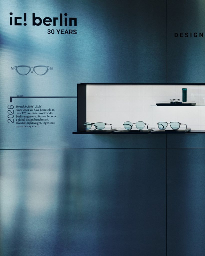 Das heißt: Alle Kollektionen werden im deutschen Hauptsitz entworfen und gefertigt. Im Jubiläumsjahr soll ein neuer Push kommen. „Seit 30 Jahren steht ic! berlin für kompromissloses Design, herausragende Ingenieurskunst und innovative Premium-Brillen aus Berlin“, erklärt Davide Lunghi, General Manager von ic! berlin. „Dieses Jubiläum würdigt unsere ­stolze Tradition und ebnet den Weg für ein neues Kapitel globalen Wachstums, Markengeschichten und moderner, technischer Brillen.“