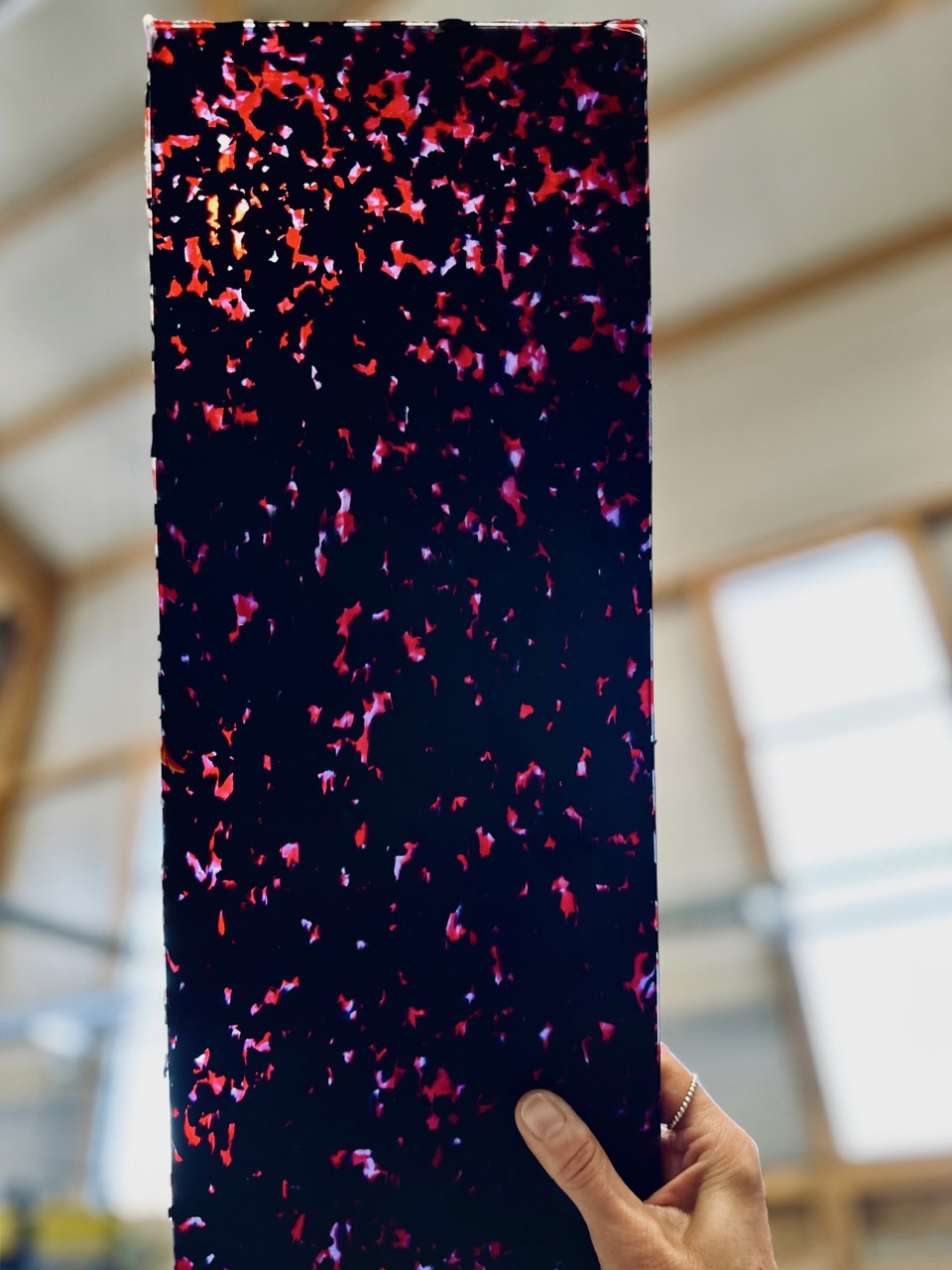 Das Granulat von mindestens 150 bis 180 Filtern wird pro Fassungs-Acetat-Platte (17 cm x 42 cm) verarbeitet, zusammen mit dem Abfall der Zigarettenindustrie, der beim Herstellen der Filter anfällt. Nichts wird einfach weggeworfen. Auch nicht in der späteren Produktion der Fassungen in Deutschland. Was bei der Fertigung einer Acetat-Fassung übrig bleibt, wird wieder zu neuem Acetat verarbeitet.