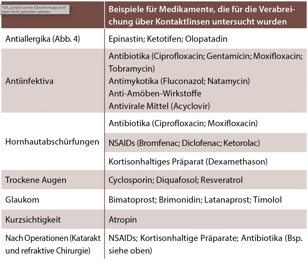 Angesichts des wachsenden Interesses an kontaktlinsenbasierten Arzneimittelabgabesystemen stellt sich die Frage, für welche Krankheiten dieses Konzept in Frage kommt. Diese Krankheiten lassen sich grob in zwei Kategorien einteilen: solche, die eine kurzfristige Behandlung erfordern (wie Hornhautinfektionen und -abschürfungen), und solche, die eine längerfristige Behandlung über Jahre hinweg erfordern (wie Allergien, Glaukom und trockene Augen). Tabelle 1 beschreibt eine Reihe von Augenerkrankungen, die als potenziell behandelbar mit diesem Konzept identifiziert wurden, sowie veröffentlichte Studien zu deren potenzieller Anwendung.