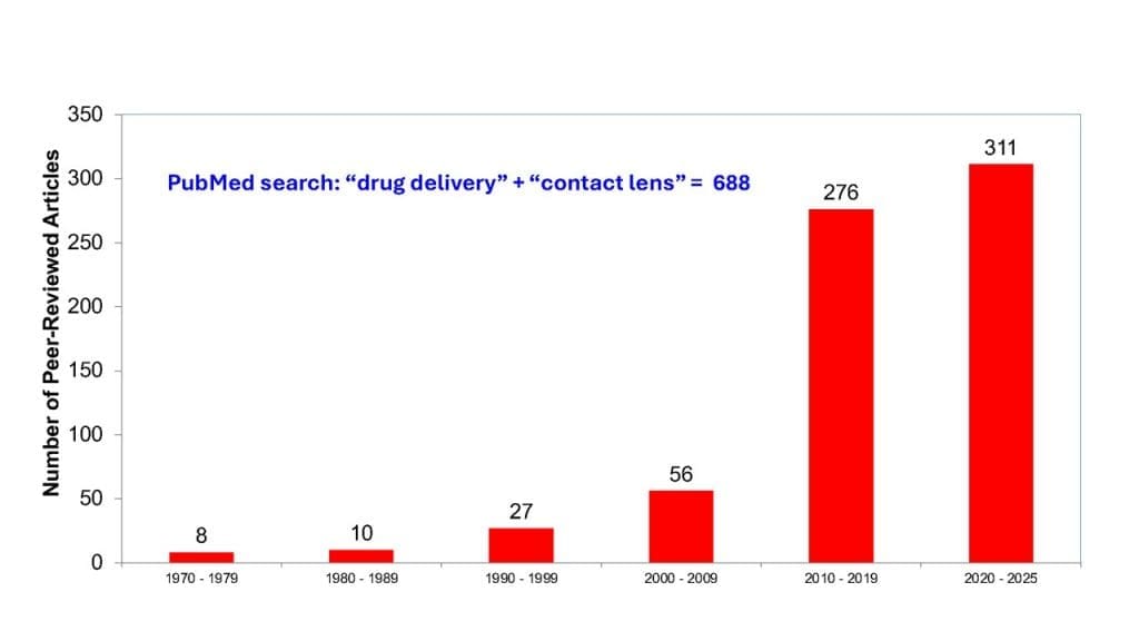 Die Einschränkungen der Therapie mit Augentropfen haben zweifellos zu einem wachsenden Interesse am Potenzial der kontaktlinsenbasierten Arzneimittelabgabe geführt, wie in Abbildung 2 dargestellt. In den 39 Jahren zwischen 1970 und 2009 wurden nur 101 begutachtete Artikel zu diesem Thema veröffentlicht. Allein in den letzten 6 Jahren erschienen über 300 Artikel zu diesem Thema, was 45% aller jemals zu diesem Konzept publizierten Artikel entspricht. Einer der wichtigsten Bereiche von Interesse sind Technologien, mit denen sowohl die Aufnahme als auch – was wichtiger ist – die kontrollierte Freisetzung des gewünschten Medikaments aus dem Linsenmaterial gesteuert werden kann. Idealerweise würden derzeit verfügbare kommerzielle KL-Materialien verwendet, von denen viele hinsichtlich ihrer potenziellen Verwendung untersucht wurden.23 Diese haben sich jedoch als unfähig erwiesen, Arzneimittel über einen ausreichend langen Zeitraum an die Augenoberfläche abzugeben.11, 12, 23