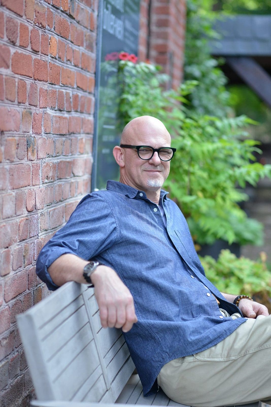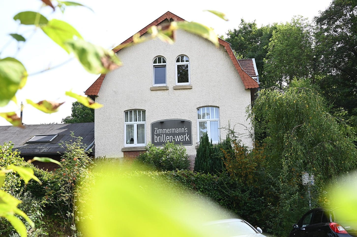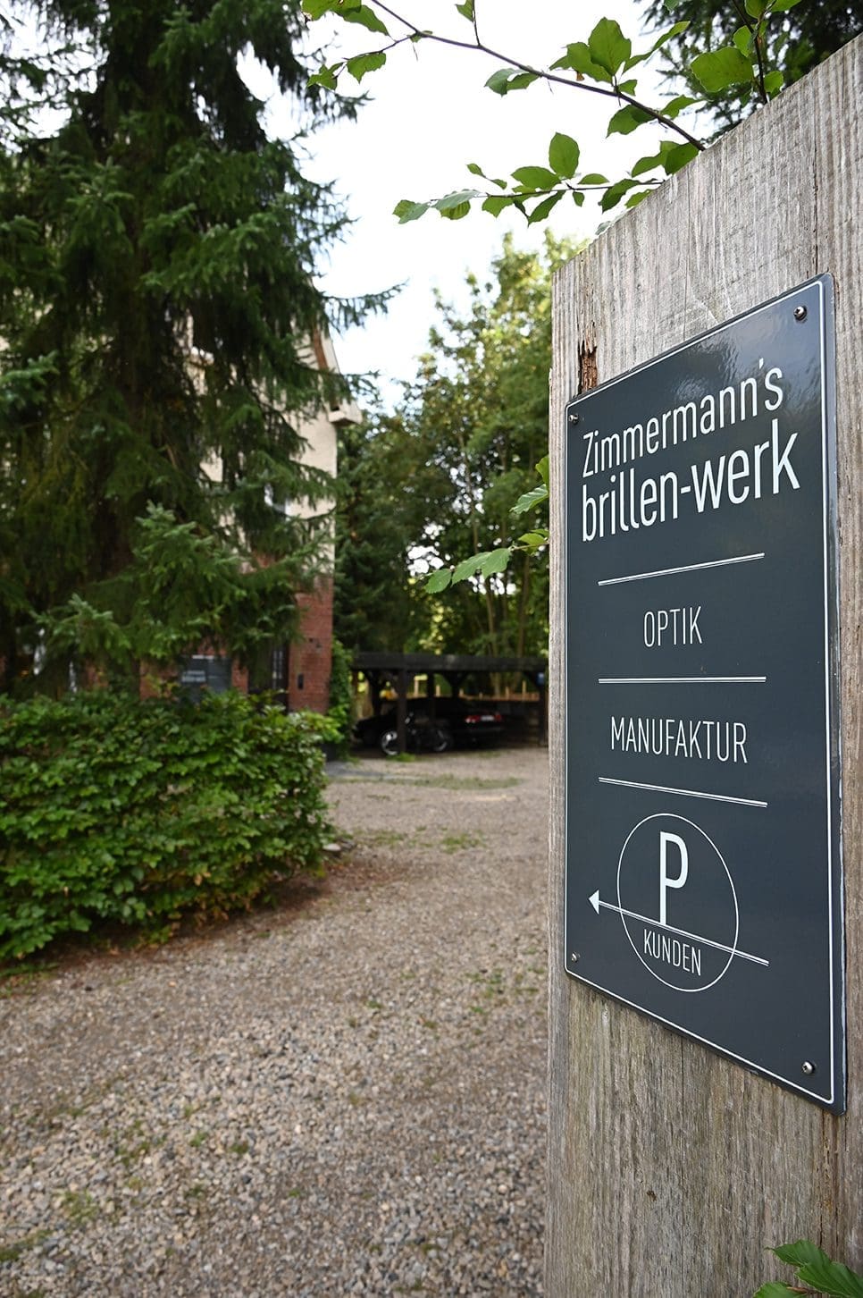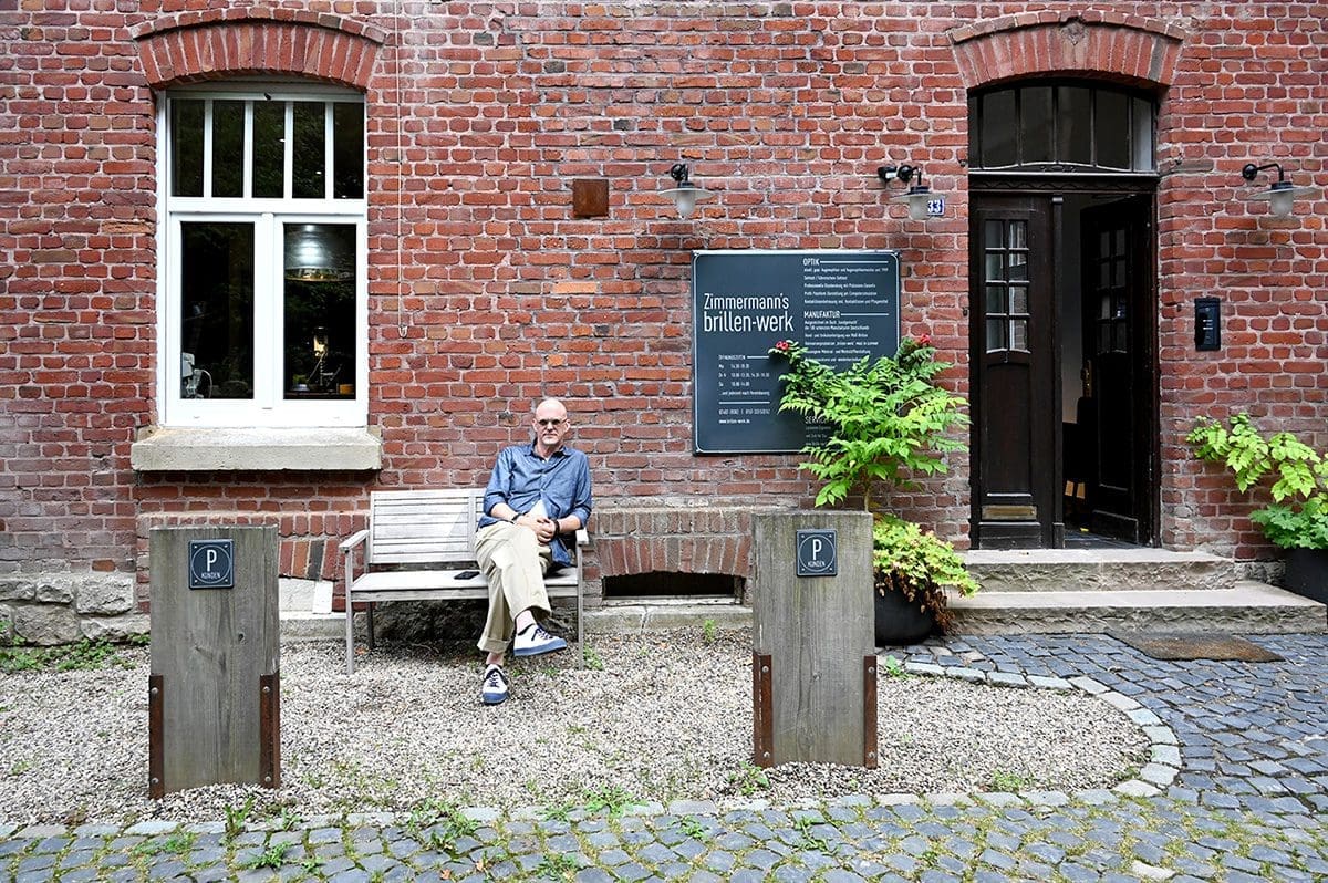 Wer über den Schotterplatz vor dem Brillen-Werk heranfährt, sieht ein historisches Gebäude aus Backsteinen und hellem Putz mit Fenstern mit Rundbögen und einem freundlichen Vorgarten. Große Schaufenster gibt es keine. Wer sich auf die Zehenspitzen stellt, kann durch die Fenster auf die Werkbank von Markus Zimmermann blicken, über der eine riesige Industrieleuchte thront oder nebenan in die Fassungsausstellung mit eigener Möbelkonzeption.
