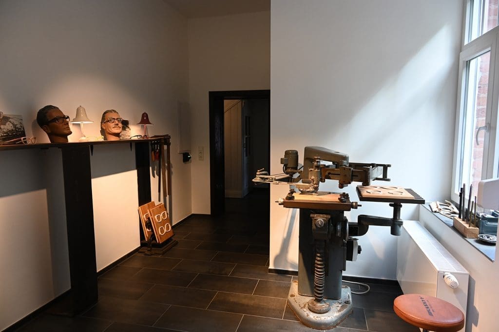Durch einen kleinen Flur linker Hand gelangen die Kunden zunächst in die Werkstatt samt Espressobar. Neben klassischem Werkzeugequipment befindet sich hier auch ein spezieller Arbeitsplatz für die Herstellung von Brillenfassungen aus Acetat, Büffelhorn, Holz oder Blech. Ein Raum weiter ist die Fassungspräsentation. Neben eigenen Kreationen finden sich hier auch Brillenfassungen namhafter Aussteller mit klassischen oder ausgefallenen Modellen. Durchquert man auch diesen, liegt rechts der Refraktionsraum mit weiteren Fassungspräsentationen. Die Räume sind hell gestrichen und bilden einen schönen Kontrast zu den dunklen Holztüren und -rahmen.