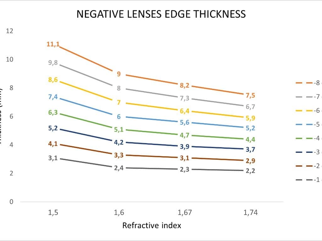 Außerdem führt die Verwendung des Brechungsindex 1,74 nicht zu leichteren Gläsern als 1,67, und bei einer Brechkraft von weniger als -6 dpt sind die Gläser sogar etwas schwerer, was bedeutet, dass die Verringerung der Dicke die erhöhte Dichte nicht ausgleichen kann. Dennoch haben Gläser mit einem Brechungsindex von 1,74 in allen Fällen eine deutlich geringere Randdicke, wie Abbildung 3 zeigt, obwohl der Vorteil bei höheren optischen Leistungen größer ist.