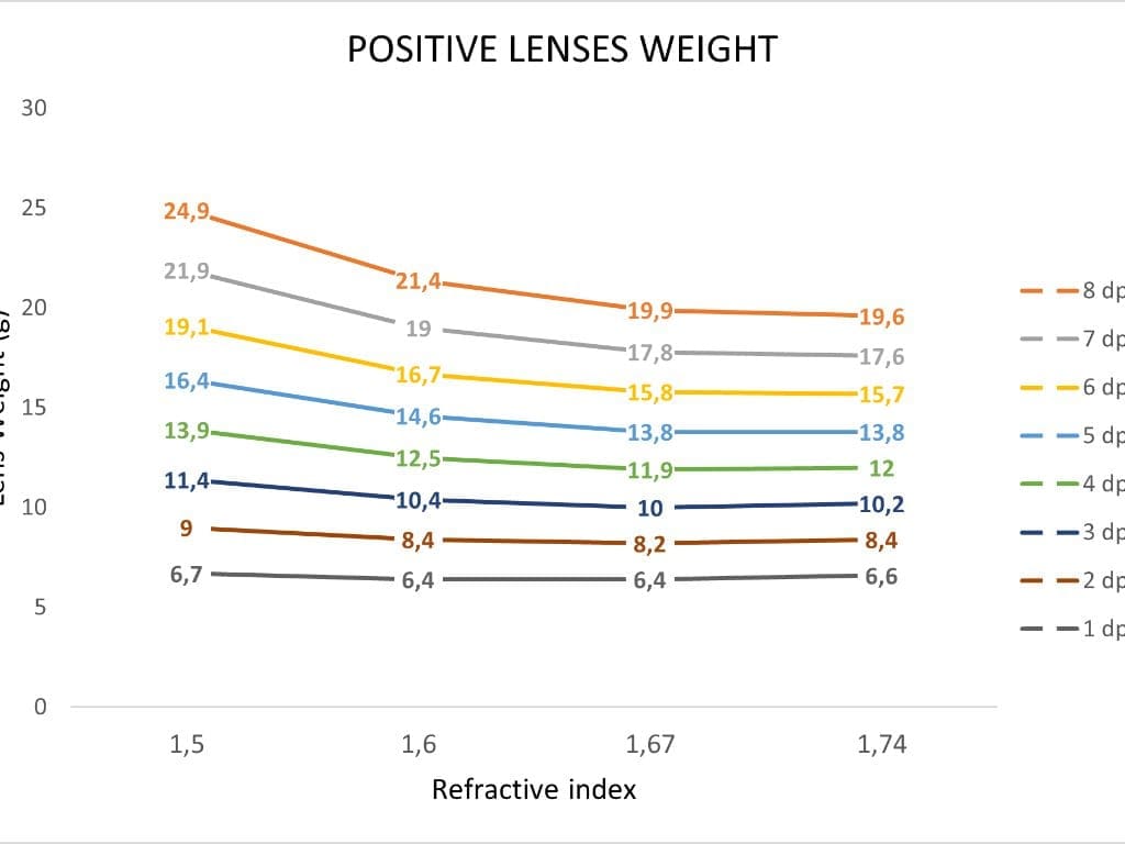 Obwohl die Beziehung zwischen Brechungsindex und Dicke leicht zu verstehen ist (ein höherer Brechungsindex führt zu dünneren Linsen), gilt dies nicht für das Gewicht der Linsen: Mit steigendem Brechungsindex nimmt auch die Materialdichte zu.
