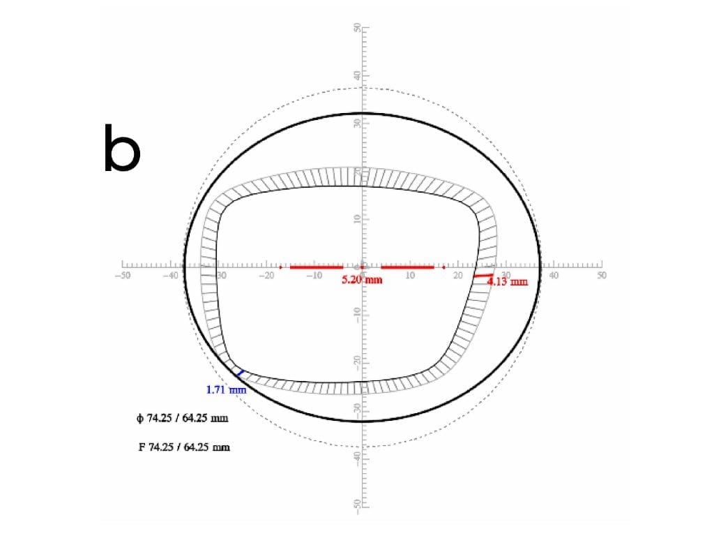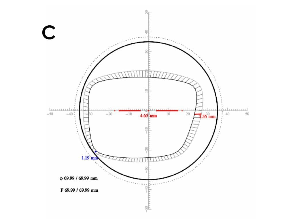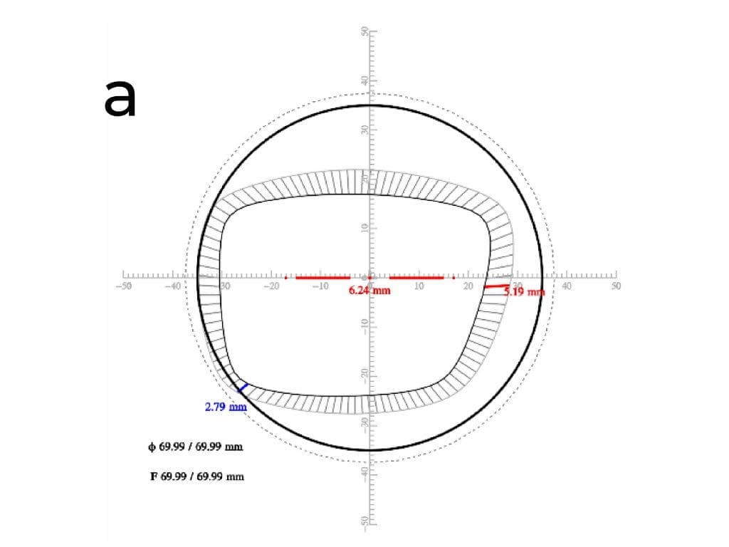 Als Nächstes muss der kleinstmögliche Durchmesser für die Herstellung der Linse bestimmt werden, denn je kleiner der Durchmesser ist, desto geringer sind das Gewicht, die Dicke und die Produktionskosten der Linse. Um den Mindestdurchmesser zu ermitteln, wendet die Software eine optimale Dezentrierung (innerhalb eines Schwellenwerts) an, indem sie den geometrischen Mittelpunkt der Fassungsform mit dem Mittelpunkt des Halbzeugs abgleicht. Dann wird der Kreisdurchmesser reduziert, bis er den Rand der Glasform berührt. Damit ist der minimale (kreisförmige) Durchmesser für die Herstellung der Linse bestimmt, und die Linse kann nun hergestellt werden (Abbildung 6a, Dickendiagramme in Millimetern).