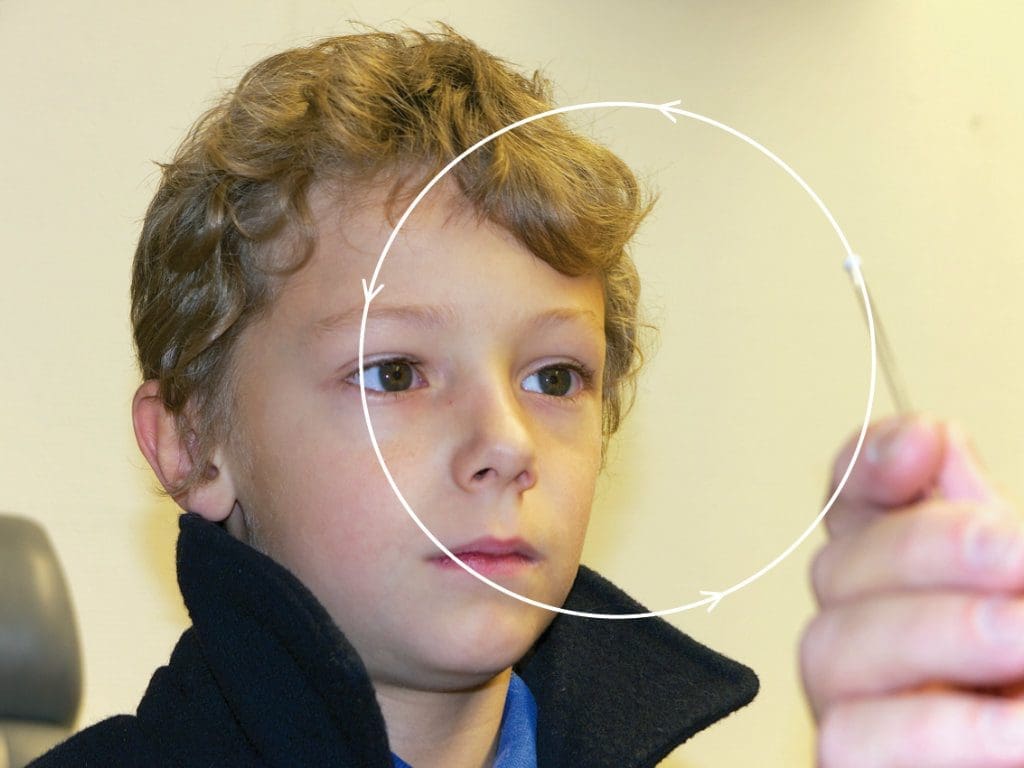 Währenddessen ist es wichtig, dass der Patient dem Fixationsobjekt möglichst nur mit den Augen und weniger mit dem Kopf folgt. Angeboten werden alle neun diagnostischen Blickpositionen, diese sind rechts, links, oben und unten, sowie diagonal rechts oben, rechts unten, links oben und links unten. Das Fixierobjekt wird dem Patienten in einer Auslenkung von circa 60 cm in der Höhe und 80 cm in der Seite angeboten.