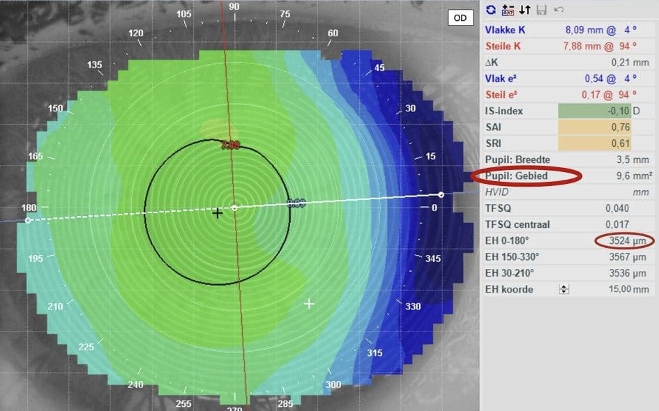 Dies liegt deutlich unter dem OC-SAG des durchschnittlichen Auges (das schätzungsweise im Bereich von 3.750 Mikrometern liegt) und fällt sogar außerhalb des Bereichs der Standardabweichung (schätzungsweise zwischen 3.550 und 3.950 Mikrometern) – was darauf hindeutet, dass es sich um ein außergewöhnlich flaches Auge handelt. Anhand der Keratometriewerte allein (8,09/7,88) ist dies nicht so einfach zu beurteilen, zumal das Auge einen durchschnittlichen E-Wert und einen Standard-Hornhautdurchmesser aufweist.