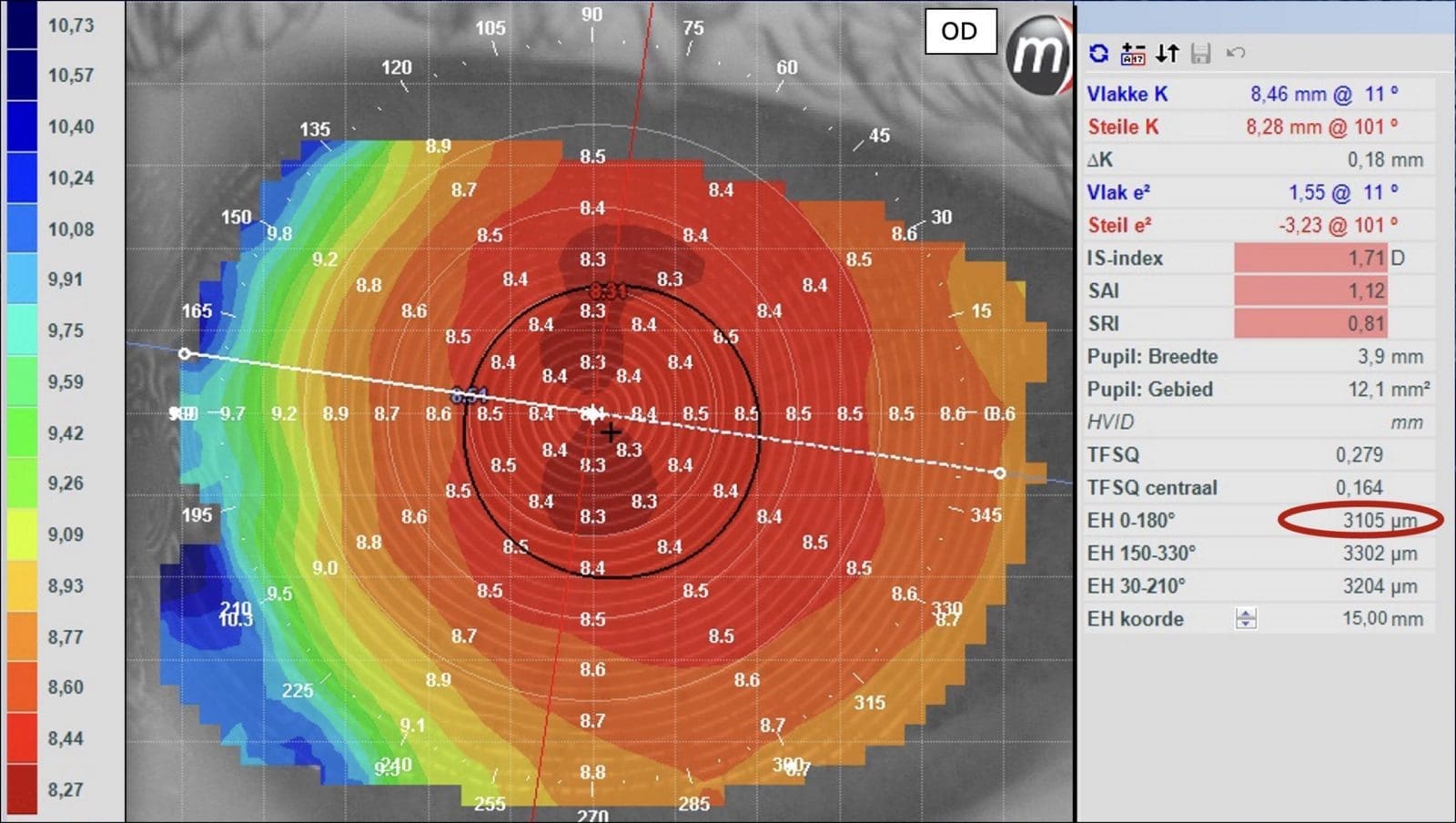 Der verwendete Hornhauttopograf verfügt zu diesem Zweck über ein spezielles Werkzeug: die E-H (estimated height – geschätzte Höhe) Software. Mit ihr kann die gesamte sagittale Höhe der Augenoberfläche (OC-SAG) über 15 mm geschätzt werden. In diesem Fall beträgt die E-H im Meridian 0-180° 3.524 Mikrometer (Abb. 2, OD dargestellt).