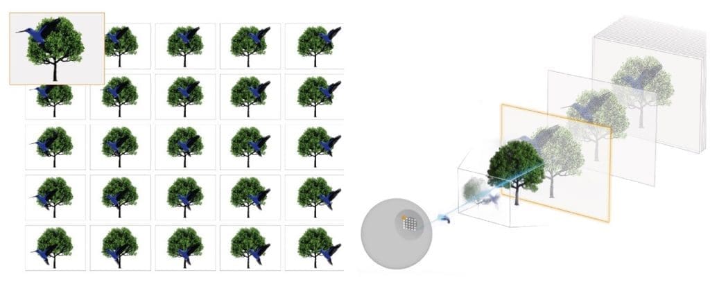 Die Lichtfeldanzeigetechnologie projiziert eine Abfolge leicht unterschiedlicher Perspektiven einer digitalen Szene (das Lichtfeld) auf das Auge. Jede Perspektive/jedes Bild wird durch den entsprechenden virtuellen Blickwinkel projiziert, der durch die Pupille des Benutzers festgelegt wird. Durch das Senden von mehr als 6.000 scharfen Bildern pro Sekunde wird die vollständige digitale 3D-Szene vor den Augen des Benutzers neu erstellt.