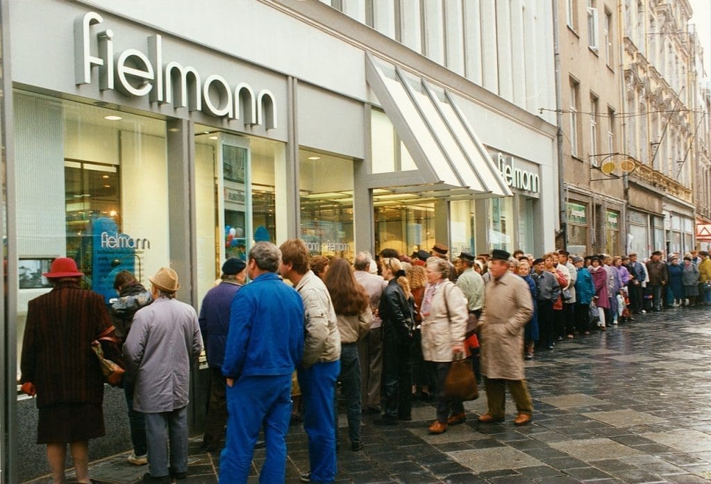 Als die Mauer fällt und sich die ganze Republik im Wandel befindet, verliert Günther Fielmann keine Zeit, sondern bereist die DDR, knüpft Kontakte, schließt Verträge mit der Sozialversicherung des Landes und eröffnet nur anderthalb Jahre nach dem Mauerfall in zahlreichen Städten Ostdeutschlands neue Niederlassungen. Die Begeisterung ist groß, es bilden sich über Monate hinweg immer wieder