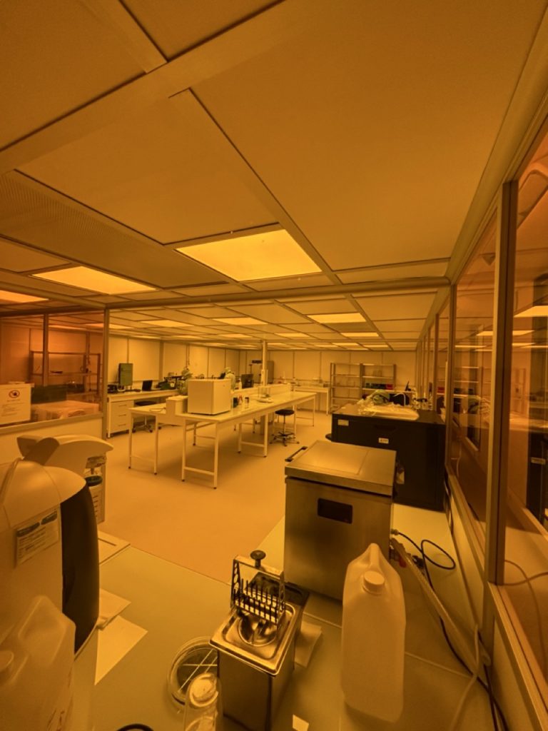 Die Komponenten – darunter beschichtete RX‑Einstärkenlinsen zur Korrektur statischer Fehlsichtigkeiten – werden von sorgfältig ausgewählten Partnern bezogen. Die Montage erfolgt in einem speziell eingerichteten Reinraum (ISO 7, 60 m²; siehe Abbildung 3). Die Fertigungslinie umfasst eigene Montage- und Prüfstände. Da Standardgeräte der Ophthalmikindustrie die technischen Anforderungen nicht erfüllen, müssen Prozesse kontinuierlich angepasst und neu entwickelt werden. Typische Arbeitsschritte wie Blocken, Schleifen oder Leistungsprüfung müssen hierfür neu konstruiert werden; andere Schritte, wie Schichtverklebung, Befüllen oder Feinabstimmung der Leistung, sind vollkommen spezifisch.