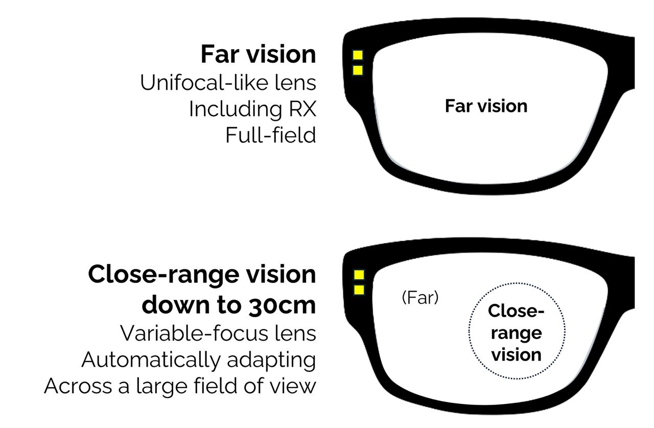 Der Fokus wird über zwei Distanzsensoren gesteuert, die die Laufzeit unsichtbarer nah-infraroter Pulse messen. Die Addition wird präzise angepasst, damit die Sehschärfe jederzeit optimal bleibt. Der Durchmesser der variablen Linsen ist so ausgelegt, dass ein komfortables Nahsichtfeld für Tätigkeiten wie Lesen, Computerarbeit oder Smartphone-Nutzung entsteht. Blickt die tragende Person in die Ferne, erweitert sich das Sichtfeld wieder, da die variable Linse bei null zusätzlicher optischer Leistung optisch „verschwindet“.