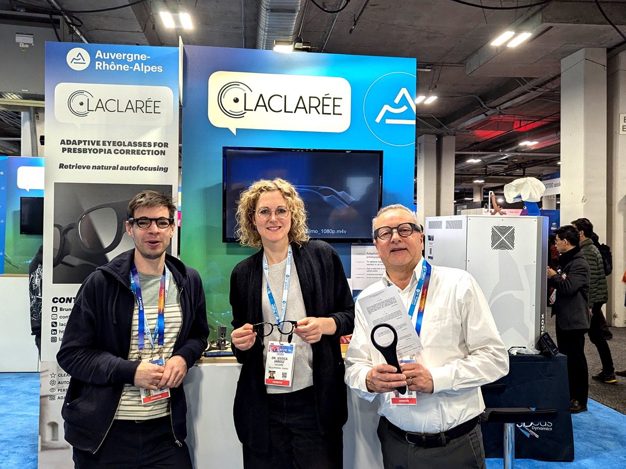 Eine wirksame Korrektur der Presbyopie erfordert eine dynamische Lösung, die scharfes Sehen in jeder Entfernung ermöglicht. Die meisten existierenden Korrektionsmethoden sind jedoch statisch und beeinträchtigen daher die Sehqualität der Nutzenden. Seit mehreren Jahren entwickelt Laclarée eine adaptive Brille auf Basis von Fokus-variablen Linsen, die durch Distanzsensoren gesteuert werden. Diese Technologie soll scharfes Sehen über ein breites Sichtfeld hinweg ermöglichen – ohne bewusste Intervention der tragenden Person.
