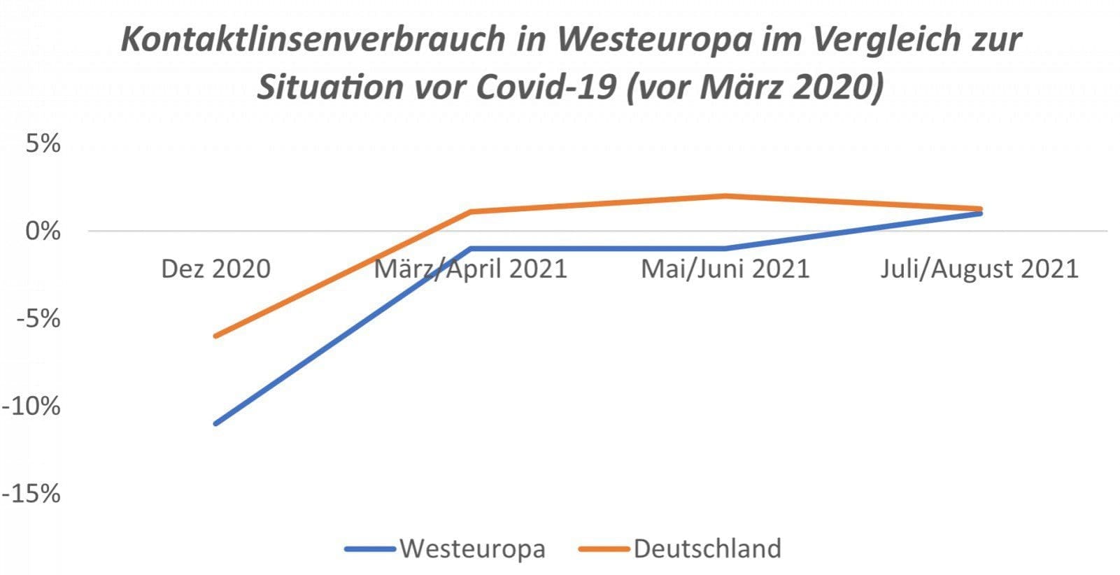 Laut der Umfrage scheint sich der Kontaktlinsenverbrauch in Westeuropa seit der Lockerung der Corona-Beschränkungen wieder zu erholen. Tatsächlich nutzen demnach 68% der befragten deutschen Kontaktlinsenträger Kontaktlinsen wieder so häufig wie vor der Pandemie, 5% sogar noch häufiger. Außerdem gaben 63% der Befragten an, die während der Pandemie keine Kontaktlinsen mehr trugen, wahrscheinlich wieder damit anfangen zu wollen. Der Gesamtverbrauch an Kontaktlinsen in Deutschland ist laut Umfrage im Laufe des Jahres 2021 um 7% gestiegen.