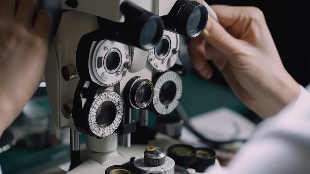 Auch bei Instrumenten gibt es Dinge, die sich nur eine KI ausdenken kann. Auf einem Bild bekommen wir ein fotografisch ansprechendes Motiv gezeigt. Doch was ist es nur? Es sieht aus, als hätte Frankenstein persönlich an eine Spaltlampe die Hälfte eines altmodischen Phoropters geschweißt.