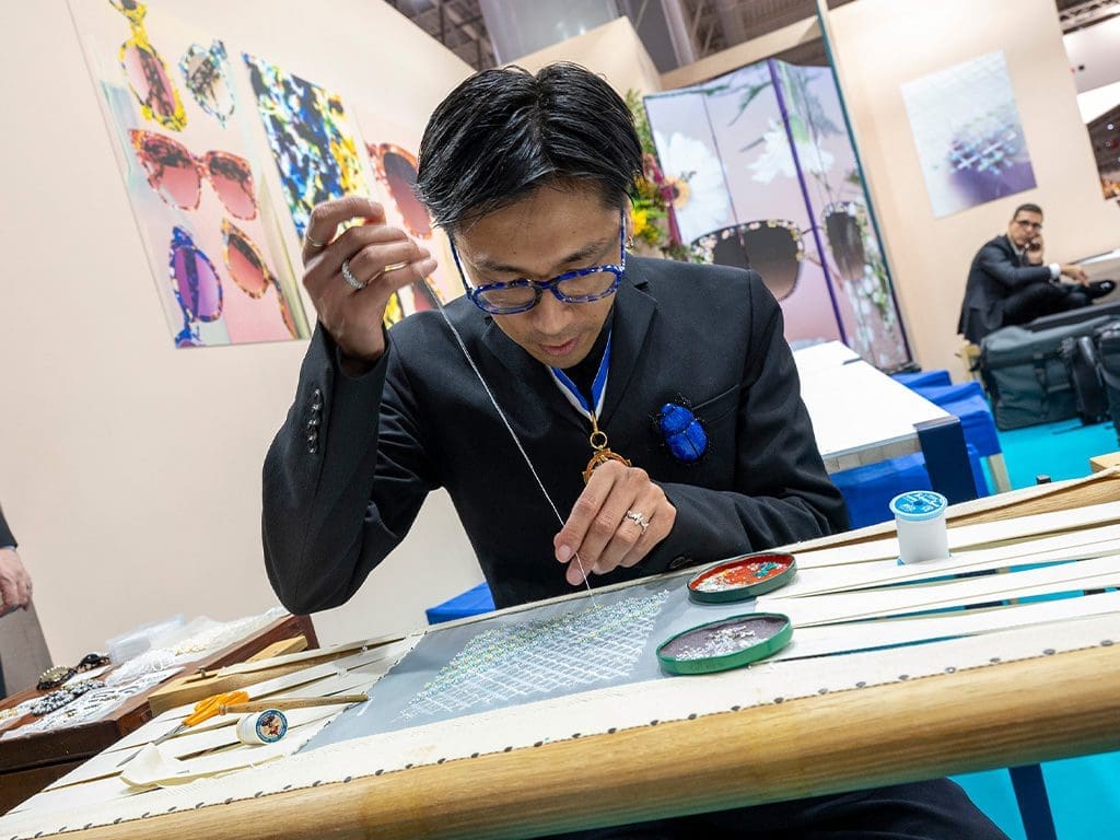 Lafont mit der Sonnenbrille Ouvrage. Hier stand klar das Haute-Couture-Konzept von Lafont im Vordergrund. In Zusammenarbeit mit Satoshi Sekimoto, Meilleur Ouvrier de France in Haute-Couture-Stickerei, wurden auf die prämierte Sonnenbrille Perlen und Verzierungen gestickt, die die Fassung wie eine Abendrobe dekorieren. Zu sehen war das live am Stand von Lafont.