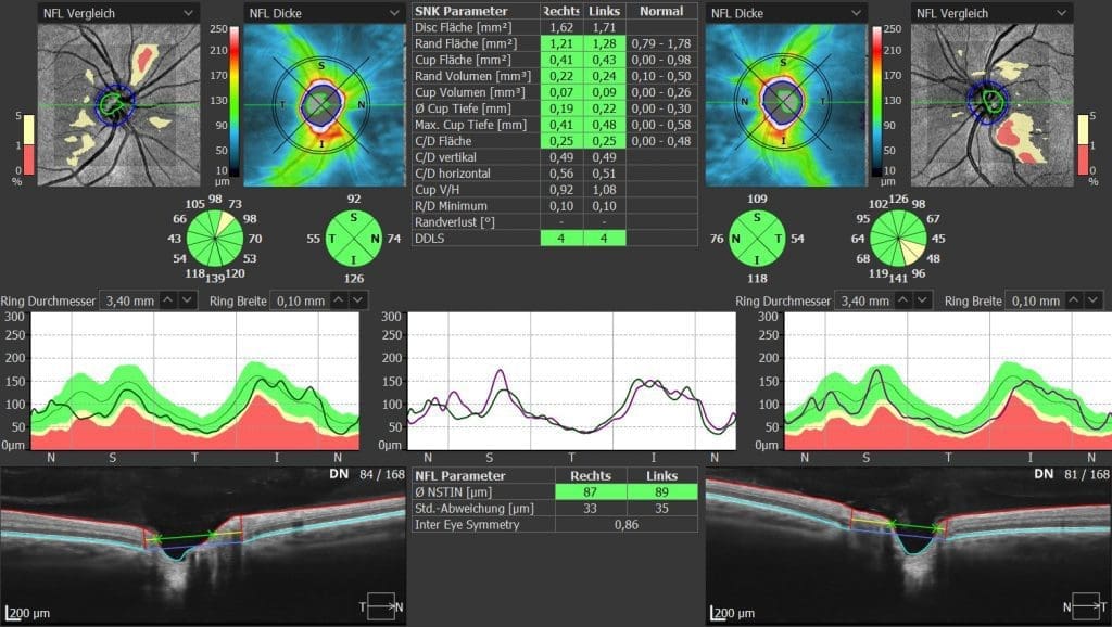 Die Werte für die Nervenfaserschichtdicke können aus einem engmaschigen 3D-Scan der Papille (Disc) ermittelt werden. Dieser kann von der Vollautomatik der OCT-Software auf Wunsch eingestellt und ausgelöst werden. Dies minimiert den Arbeitsaufwand und erhöht den Komfort für den Kunden. Die Auswertung in Abbildung 3 sieht auf den ersten Blick kompliziert aus, wird aber mit einer gezielten Einarbeitung in die Software ausführlich erläutert. Die grünen, gelben und roten Bereiche zeigen den Vergleich zur normativen Datenbank.