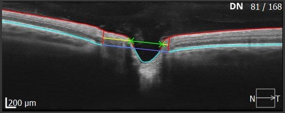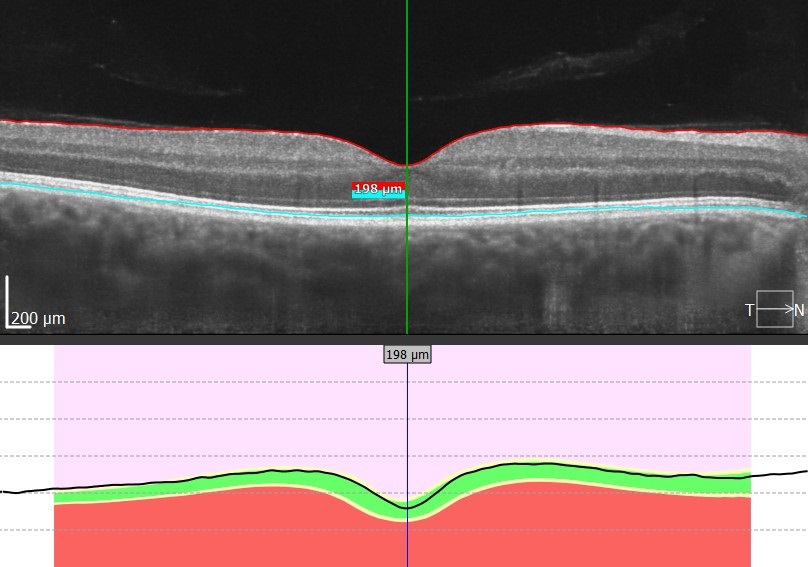 Die Netzhautdicke ist der Bereich zwischen der inneren Grenzmembran (ILM) und dem retinalen Pigmentepithel (RPE). Der Wert wird auf einer Fläche von 6 x 6 mm erfasst. Dafür wird eine Retina-3D-Untersuchung auf einer Fläche von 10 x 10 mm aufgenommen. Abbildung 1 zeigt den B-Scan einer Netzhaut. Oberhalb der roten Linie liegt der Glaskörper, unterhalb der türkisfarbenen Linie liegt die Aderhaut. Zwischen den beiden Linien liegen die regelmäßig angeordneten Schichten der Netzhaut. Die vertikale grüne Linie zeigt einen einzelnen A-Scan innerhalb des B-Scans mit der gemessenen Netzhautdicke für diesen Punkt. Der Wert wird im Diagramm darunter mit der Norm-Datenbank verglichen. Die Farben entsprechen der weiter oben im Artikel beschriebenen prozentualen Einteilung. Bei der Netzhautdicke wird auch die „positive Abweichung“ normativ erfasst, wodurch z.B. die Erkennung von ödematösen Veränderungen (Verdickungen) unterstützt wird.