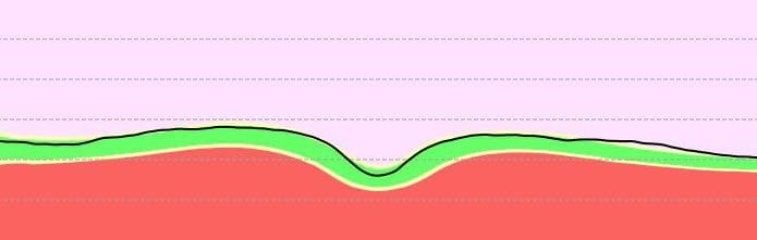 Betrachtet man in Abbildung 6 die Netzhautdicke des vorliegenden Falls, so zeigen die Messwerte auf der rechten Seite eine Erhöhung in den rosafarbigen Bereich hinein. Der Messwert liegt damit im > 99% Bereich, was nichts anders bedeutet, als dass 99% aller Probanden in der normativen Datenbank an dieser Stelle eine dünnere Netzhaut hatten. Im Gegensatz dazu zeigt sich in Abbildung 7 ein kleines Stück Nervenfaserschichtdicke, die den roten Bereich touchiert. Daraus kann die Information gelesen werden, dass 99% der Probanden in der Norm-Datenbank an dieser Stelle eine dickere NFL vorweisen konnten.