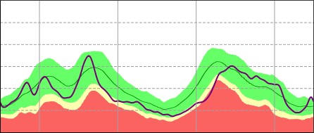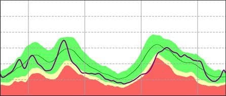 Abbildung 6 zeigt die typische Darstellung der Netzhautdicke im OCT und Abb. 7 die der Nervenfaserschichtdicke. Die grün markierten Bereiche entsprechen den 5 bis 95 Perzentilen, was bedeutet, dass 90% aller Messwerte der Probanden und Probandinnen der normativen Datenbank in diesem Bereich liegen. Der gelbe Streifen unterhalb des grünen Bereichs, markiert den Bereich von 1 bis 5%, der anschließende rote Bereich den < 1%. Wie vorab bereits erwähnt, werden bei der Netzhautdicke auch „positive Abweichungen“ dokumentiert, daher gibt es in der Darstellung der Netzhautdicke auch einen gelben (95 – 99%) und einen rosa (> 99%) Bereich. Diese Bereiche entfallen bei der Nervenfaserschichtdicke (Abb. 7). Die dunkle Linie zeigt in beiden Abbildungen die Messwerte der aktuellen Person.