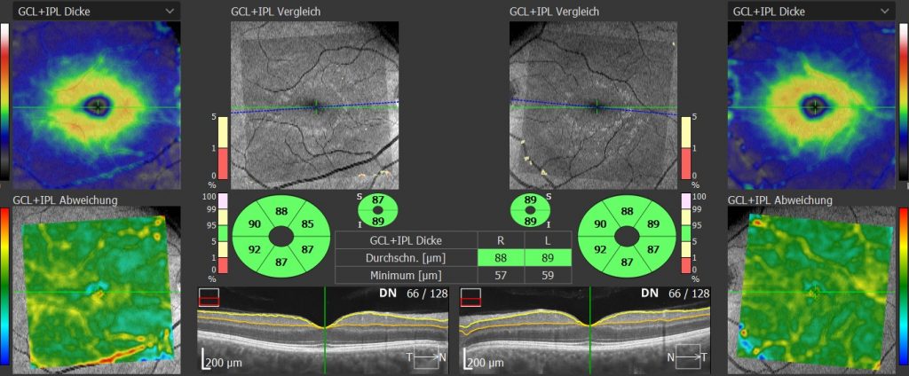 Die Messung der Ganglienzellen erfolgt, ebenso wie die Netzhautdicke, in einem 3D-Scan der Retina. Dazu liegt optimalerweise eine Messung beider Augen vor. Dies ermöglicht zusätzlich einen Asymmetrie-Vergleich der beiden Augen. Die Auswertung der GCL+IPL ergibt den sogenannten „Donut“, welcher in Abbildung. 2 zu sehen ist. Die Dickenmessung erfolgt zwischen der orangefarbenen und der gelben Linie. Die Auswertung umfasst zusätzlich einen Vergleich der Sektoren mittels Tortendiagramm und einen Vergleich der Mittelwerte über die gesamte Fläche.