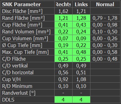 Das Cup-Disc-Verhältnis ist wohl der Goldstandard in der Glaukomdiagnostik. Zahlreiche Studien haben die Wirksamkeit des Parameters und die Zuverlässigkeit der Vorhersage bestätigt. Auch bei der Sehnervenkopf-Analyse des OCT wird dieser Parameter berücksichtigt und ist ebenfalls normativ erfasst. Zusätzlich werden zahlreiche andere Parameter berücksichtigt und normativ erfasst (siehe Abbildung 4).
