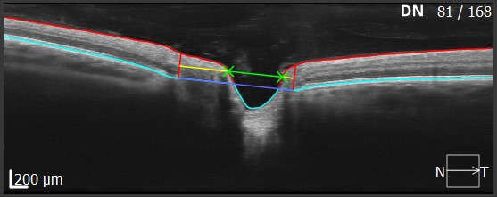 In Abbildung 5 sind die Markierungen in den verschiedenen Schichten zur Berechnung der Cup-Disc eingezeichnet. Sowohl für die Werte der Nervenfaserschichtdicke als auch für die Ergebnisse der Cup-Disc-Statistik können deutliche Abweichungen zur Norm vorhanden sein, ohne dass es sich dabei um krankhafte Veränderungen handelt. Der exakte Winkel, in dem die Nervenfasern aus der Papille austreten, können deutlich variieren. Auch die Größe der Disc und Cup können ganz individuelle Werte annehmen, ohne sofort als pathologisch zu gelten. Insbesondere die Fehlsichtigkeit des Kunden muss an dieser Stelle als beeinflussender Parameter betrachtet werden.