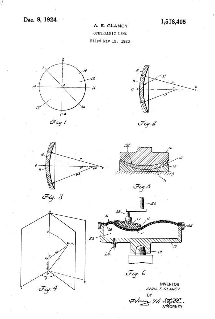 Dr. Anna Estelle Glancy (1883–1975) entwarf 1923 bzw. 1924 das erste Patent für ein Gleitsichtglas, nahezu 50 Jahre vor der Marktreife solcher Gläser. In einer männerdominierten Branche setzte sie sich durch und prägte die moderne Augenoptik nachhaltig – auch wenn ihre Beiträge lange im Schatten blieben.