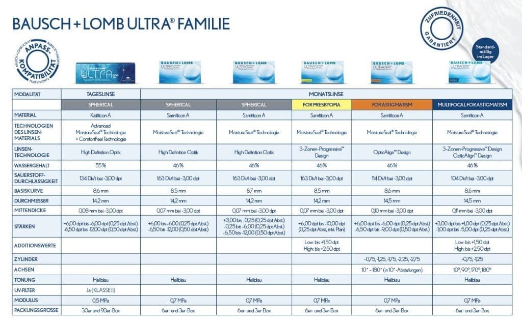 Die Bausch +Lomb ULTRA® Familie ist in folgenden Parametern verfügbar: