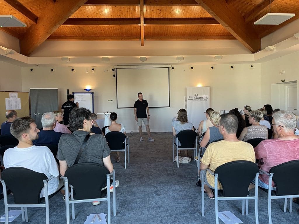 Wenn um neun Uhr das Vortragsprogramm beginnt, wandelt sich die Atmosphäre. Der klimatisierte Seminarraum füllt sich, ein konzentrierter Blick legt sich über die Gruppe. Tom Smits präsentiert die neusten GfK-Zahlen zur Branche. Seine Präsentation zeigt nicht nur statistische Klarheit, sondern auch wichtige Impulse für den wirtschaftlichen Alltag der anwesenden Augenoptiker. Trends im Kaufverhalten, Marktdynamiken, Chancen und Risiken – all das bildet ein stabiles Fundament für die weiterführenden Diskussionen der folgenden Tage.