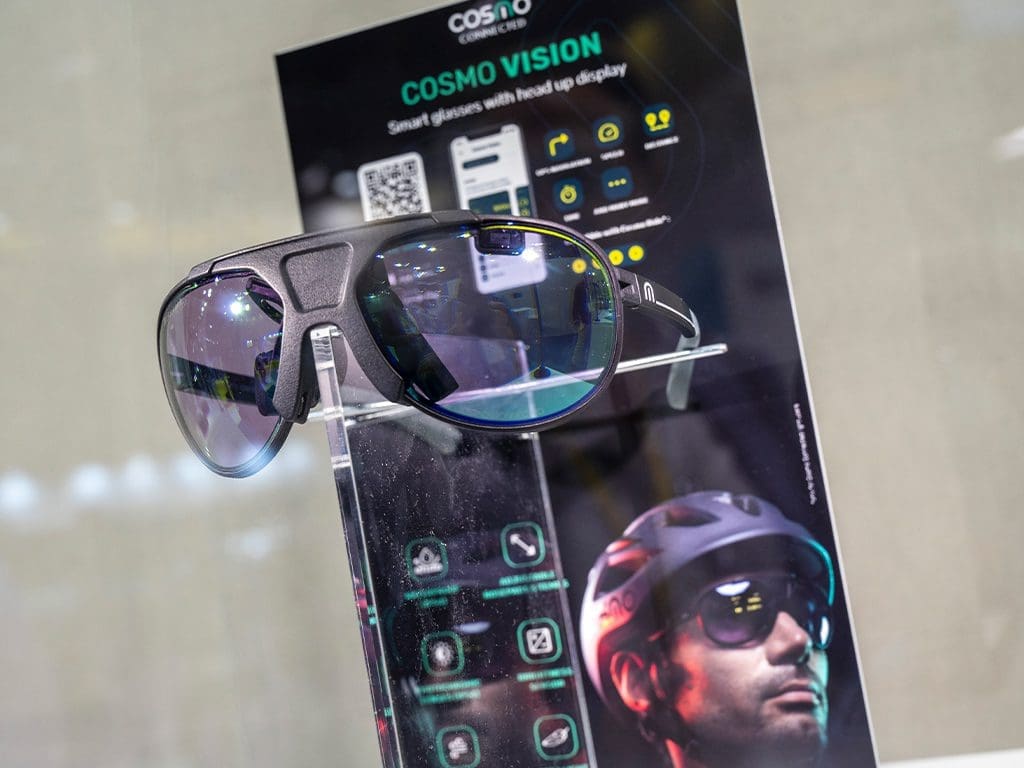 Wie diese nicht allzu ferne Zukunft bereits aussehen kann, zeigt der französische Hersteller Cosmo Connected mit der Cosmo Vision. Sie ist eine Biker-Brille. Diese vernetzt sich per Bluetooth mit dem Smartphone. Über die Cosmo Vision-App erfolgt dann der Datentransfer vom Telefon ins rechte Brillenglas, wo sich Geschwindigkeit, Fahrzeiten sowie Navigationshinweise anzeigen lassen. Praktisch ein Head-up-Display, das man schon von smarten Helmen her kennt. Jetzt aber durchaus auch für Rollerfahrer und Jethelmträger geeignet. Gesteuert wird die Anzeige in der Brille per Wischbewegung über den Sensor am linken Glas.