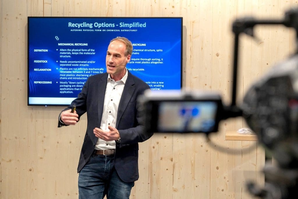Mitten im Thema Kreislaufwirtschaft war Prof. Dr. Florian Turk. Als Start-up-Gründer (Microwave Solutions) und Recyclingspezialist brachte er spannende Einblicke in den aktuellen Stand der Recyclingtechnologie im Kunststoffbereich.