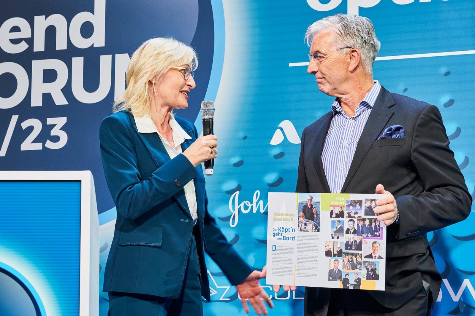 Erstmals eröffnete Mirjam Rösch als neue Augenoptik-Vorsitzende bei Spectaris die Gelegenheit und nutzte das Event so wie die weiteren Trendforum-Mitstreiter – u.a. Wolfram Kons als Wegbegleiter der ersten Stunde – auch als gebührenden Raum für die Verabschiedung von Josef May, der sein Amt beim Industrieverband bereits im ­September nach 17 Jahren an die Hoya-Geschäftsführerin abgegeben hatte. May erhielt Standing-Ovations für seine langjährigen Verdienste und konnte an diesem Tag des großen Wandels, auch für ihn selber, noch ein allerletztes Mal die traditionelle Tageszusammenfassung kurz vor Schluss zum Besten geben.