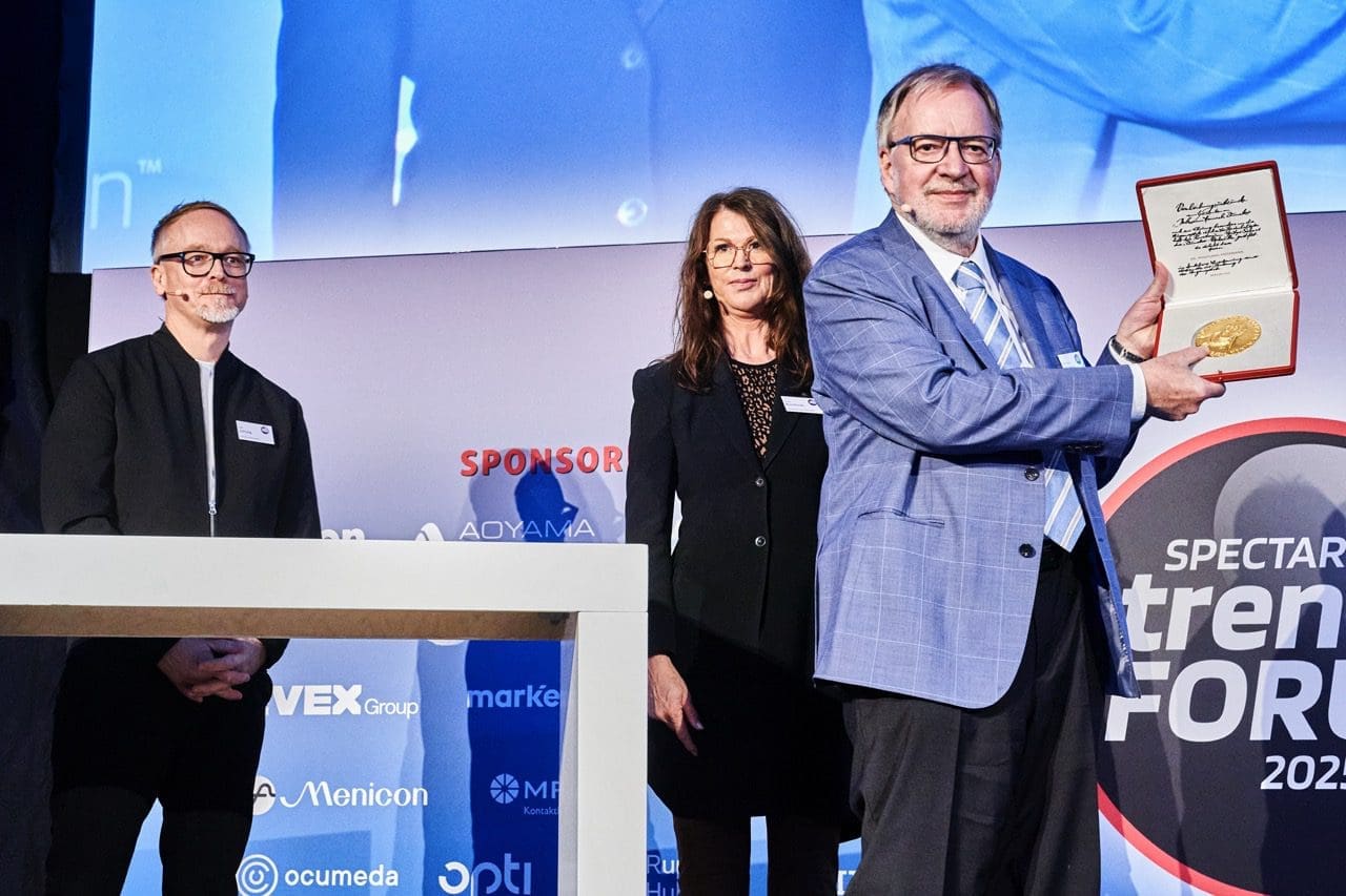 Im Anschluss wurde es dann wieder sehr „augenoptisch“, als Maik Hartung, Carl Zeiss Vision, und Kerstin Kruschinski, Kuratorium Gutes Sehen, mit dem Thema: „Am Puls der Zeit – digitale Wege zum Konsumenten“ die Bühne betraten. Die zentrale Frage: Wie bringe ich augenoptisches Wissen an den Konsumenten und diesen im besten Falle zum Augenoptiker? Es geht um gut recherchiertes Wissen, um eine endverbrauchergerechte Aufarbeitung der Themen und um das Erkennen, was für die Verbraucher wirklich wichtig ist. Das Kuratorium Gutes Sehen ist die Plattform, die den augenoptischen Alltag nach außen trägt und durch viel Engagement und Durchhaltevermögen eine immense Reichweite aufgebaut hat. Dieser Erfolg geht nicht über Nacht und schon gar nicht ohne die entsprechende Expertise. Prof. Dr. Wolfgang Wesemann begleitet das KGS bereits seit rund 25 Jahren und wurde im Rahmen der Veranstaltung mit der Duncker-Medaille geehrt. Es ist eine Auszeichnung für sein Lebenswerk in der Physik, Medizin, Augenoptik und für die Aufklärungsarbeit, die er im Laufe der Jahre geleistet hat. Diese Ehrung erhalten Persönlichkeiten, die mit Wissen, Leidenschaft und Engagement die Augenoptik nachhaltig geprägt haben.