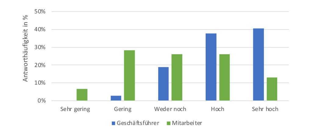 Bei der Einschätzung des umweltbewussten Handelns in den augenoptischen Fachgeschäften ließen sich oftmals gravierende Unterschiede zwischen dem Antwortverhalten der Geschäftsführer und dem der Mitarbeiter feststellen. So auch bei der Einschätzung des Stellenwerts der Vermeidung von Umweltbelastungen in den Betrieben, wie man der Abbildung 1 entnehmen kann. Es ist interessant, dass nur einer von 36 Geschäftsführern den Stellenwert in seinem Betrieb als gering einstufte, während insgesamt 35% der Mitarbeiter die Stufen „gering“ oder „sehr gering“ auswählten. Im Gegensatz dazu waren 41% der Geschäftsführer der Meinung, dass der Stellenwert in ihrem Betrieb sehr hoch ist. Dem konnten nur 13% der Mitarbeiter zustimmen.