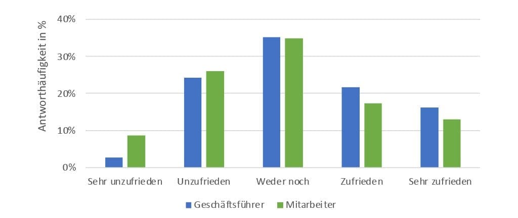 Eine zusätzliche Übersicht des prozentualen Antwortverhaltens ist in Tabelle 3 zu sehen. Es fällt auf, dass insgesamt 31% aller Teilnehmer aktuell entweder sehr unzufrieden oder zufrieden sind. 35% teilen eine neutrale Einstellung. Im Ganzen sind 34% aller Befragten entweder zufrieden oder sehr zufrieden.