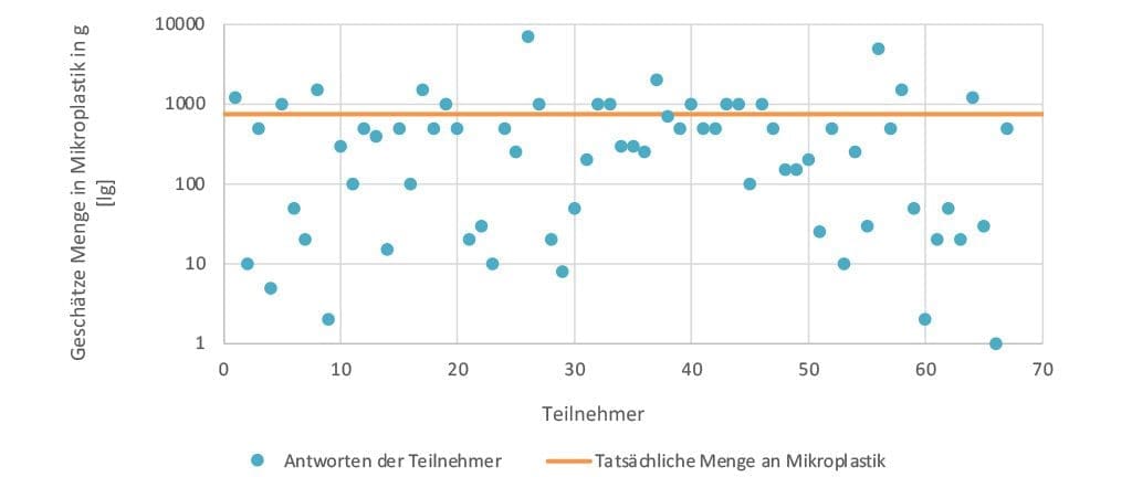 Die Menge an Mikroplastik, die beim Schleifen von 100 Kunststoffgläsern entsteht, wurde im Durchschnitt auf 606,4 g geschätzt. Alle einzelnen Antworten sind im Diagramm, welches in Abbildung 3 zu finden ist, dargestellt. Tatsächlich entstehen insgesamt rund 750 g Mikroplastik, wie es der durchgeführte Versuch zeigte.