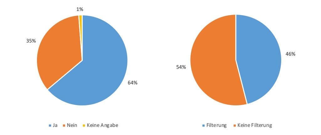 Den Bekanntheitsgrad von Filtersystemen für Schleifautomaten kann man der Abbildung 4 entnehmen. Die Mehrheit der Teilnehmer hat bereits von Filterungsmöglichkeiten gehört, 35% jedoch noch nicht. Eine Verteilung, in wie vielen Betrieben das Schleifwasser tatsächlich gefiltert wird, kann man der Abbildung 5 entnehmen. Mehr als die Hälfte aller teilnehmenden Betriebe lassen demnach ihr Schleifwasser bisher nicht filtern, 46% jedoch schon.