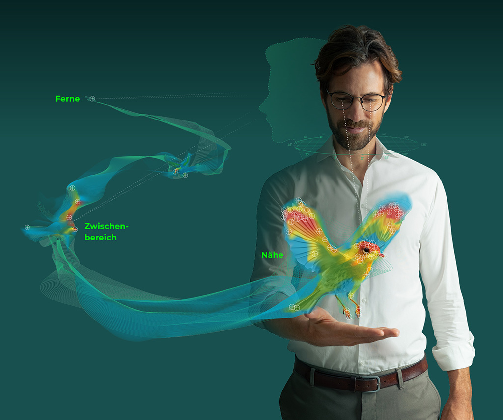 Die Basis für das neue Glasdesign bildet eine innovative VR-Messung, die innerhalb von nur 90 Sekunden das persönliche Sehverhalten des Kunden erfasst. In einer virtuellen Südseeumgebung folgt der Brillenträger mit Kopf- und Augenbewegungen einem Vogel. Dabei werden unter anderem Okulomotorische Merkmale, Augenbewegungsgeschwindigkeiten und Pupillendynamik registriert.